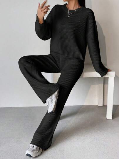 SHEIN Unity Drop Shoulder Sweater & Knit Pants - Black - View 1