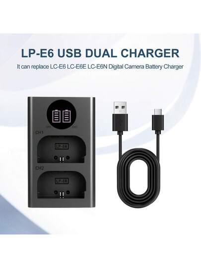 EDEKOY LP-E6 USB Dual Slot Rechargeable Battery Charger, Compatible With Canon LP-E6NH, LP-E6N, LP-E6 Batteries; DL-E6 LED Display Camera Battery Charger, Compatible With Canon R7, R6, R5, 5D-IV/III/II, 5DS, 6D, 6D-II, 7D D-II, 90D, 80D, 70D, 60Da Cameras - Black - View 1