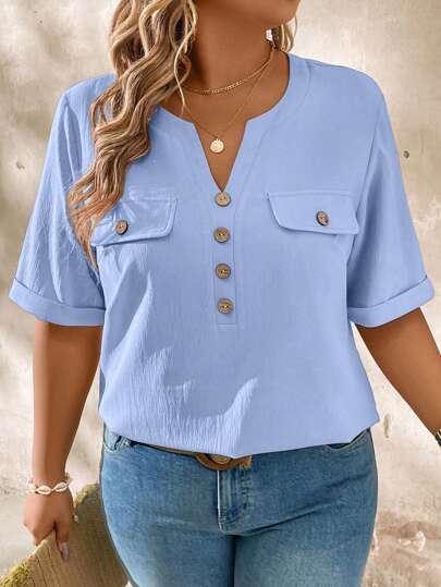 EMERY ROSE Casual Notched Neck Wood Button Decor Plus Size Short Sleeve Shirt Baby Blue - Blue - View 1