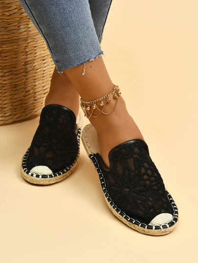 Crochet Lace Espadrille Flat Mules - Black - View 1