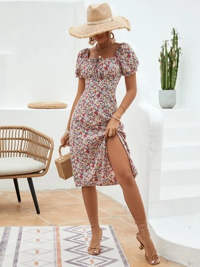 SHEIN VCAY Ditsy Floral Print Knot Front Split Hem Dress - Multicolor - View 1