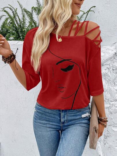 EMERY ROSE Figure Graphic Asymmetrical Neck Tee For New Year Clothes Graphic Tees Women Tops - Red - View 1