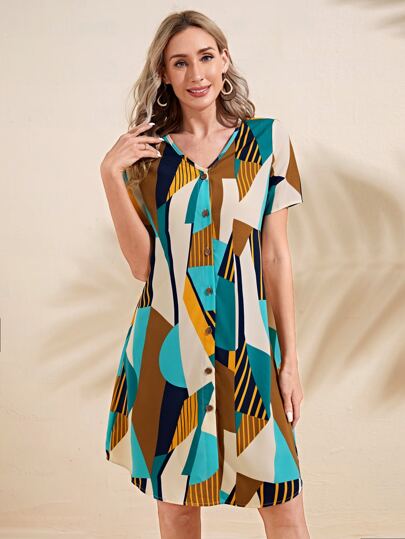 EMERY ROSE Geo Print Curved Hem Dress - Multicolor - View 1