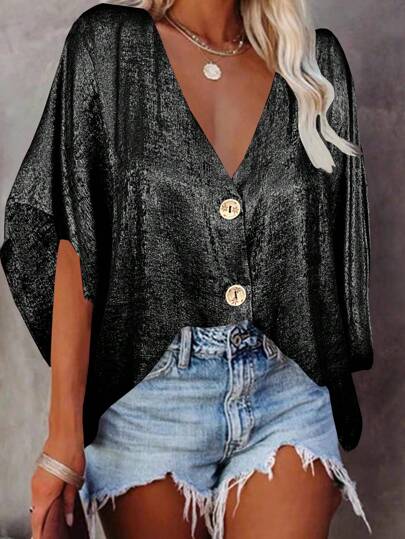 EMERY ROSE Loose Fit Drop Shoulder Shirt With 3/4 Sleeve And Gold Foil Print - Silver - View 1