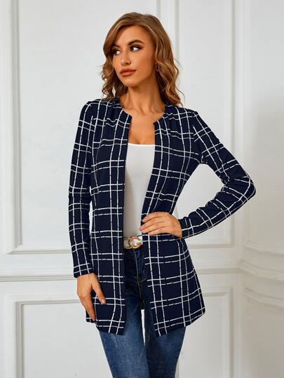 SHEIN Clasi Plaid Open Front Coat In Fall/Winter - Navy Blue - View 1