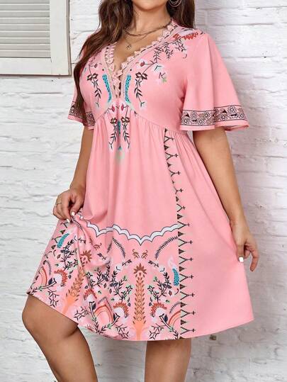 EMERY ROSE Plus Size V-Neck Printed Ruffle Sleeve Summer Dress For Vacation - Multicolor - View 1