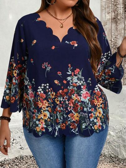EMERY ROSE Plus Size Women Blue Floral Print Blouse For Autumn - Navy Blue - View 1