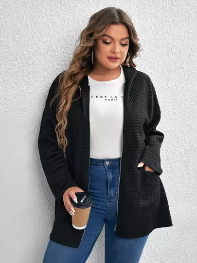 SHEIN LUNE Plus Zip Up Drop Shoulder Hooded Coat - Black - View 1