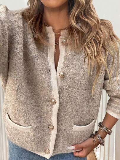EMERY ROSE Short Pocket Knitted Cardigan Sweater,Long Sleeve Tops - Camel - View 1