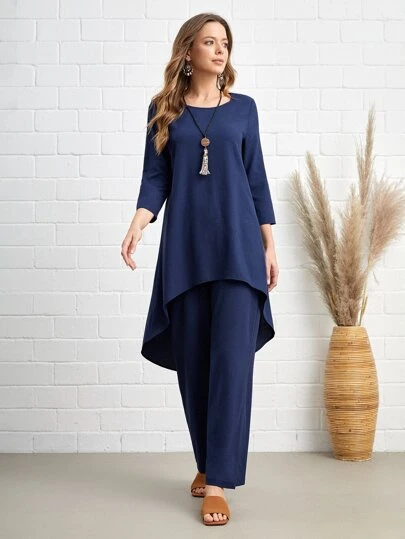 EMERY ROSE Solid High Low Hem Tunic Blouse & Pants - Blue - View 1