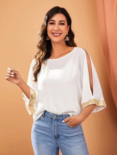 SHEIN VCAY Split Sleeve Contrast Sequin Top - White - View 1