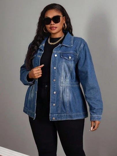 EMERY ROSE Winter Plus Size Women's Casual Single-Breasted Denim Jacket, Autumn - Dark Wash - View 1