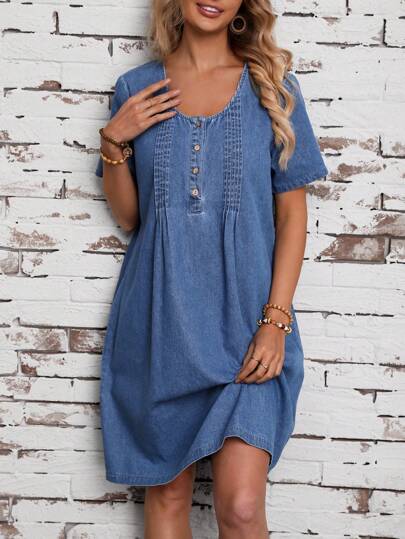 Women's Button Front Short Sleeve Denim Dress - Blue - View 1