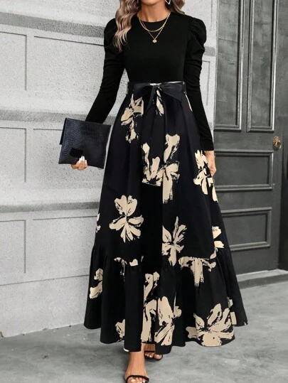 EMERY ROSE Women's Elegant Floral Print Puff Sleeve Tie Waist Dress, Spring/Autumn Clothes For University Fall Cloth For Women - Black - View 1
