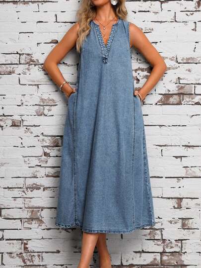 EMERY ROSE Women's Summer Sleeveless Loose Straight Denim Dress With Notched V-Neck And Pocket - Dark Wash - View 1