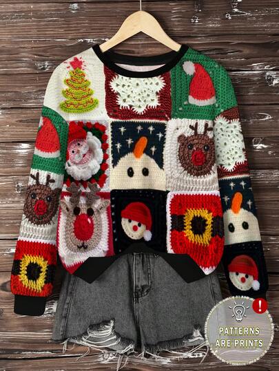 EMERY ROSE Women's Sweatshirt / Digital Printing / Christmas Pattern Full Body Imitation Sweater Printing / Christmas Long Sleeve Round Neck Plush Sweatshirt / Casual Retro Sweatshirt, Christmas Sweatshirt Autumn And Winter Fashion / Fashionable Sweatshirt / Happy New Year Gift, Family New Year Shirt, Christmas Party T-Shirt Top, Cute Christmas Holiday Gift / Women's Casual Loose Round Neck Top / Autumn And Winter - Multicolor - View 1