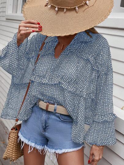 EURMUSE Allover Print Frill Trim Tie Neck Flounce Sleeve Blouse - Baby Blue - View 1