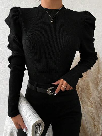 EURMUSE Cotton Half-High Collar Leg-Of-Mutton Sleeve T-Shirt - Black - View 1