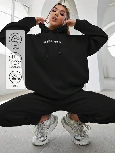 EURMUSE Cotton Slogan Graphic Drop Shoulder Drawstring Hoodie & Sweatpants - Black - View 1