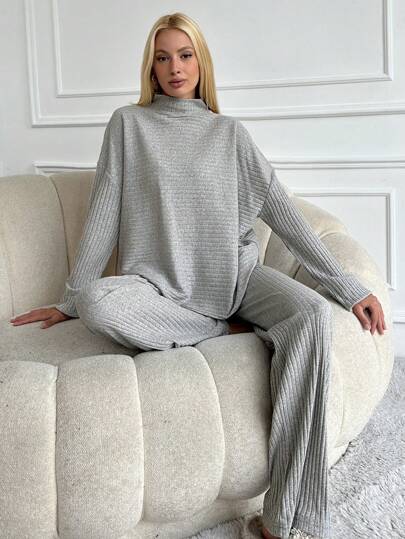 EURMUSE Funnel Neck Drop Shoulder Tee & Pants - Light Grey - View 1