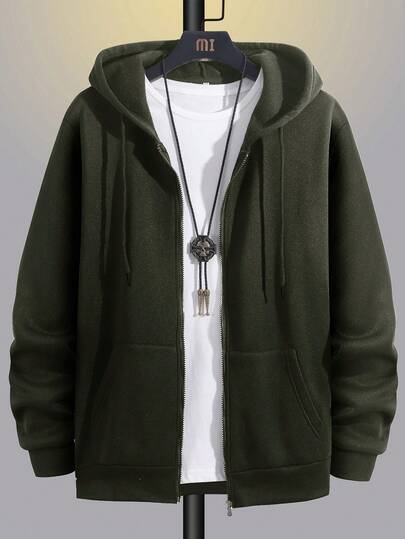 EURMUSE Men Basic Style Pocket Zip Up Loose Fit Casual Hoodie - Army Green - View 1