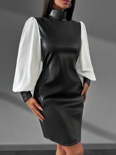 EURMUSE WOMAN BLACK LEATHER MINI DRESS WITH WHITE SLEEVES - Black - View 1