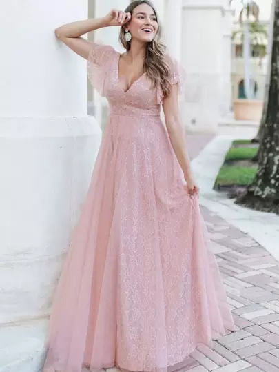 EVERPRETTY Flutter Sleeve Lace Prom Dress - Pink - View 1