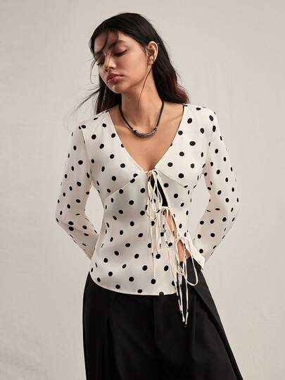 Easelle Women's Polka Dot Print V-Neck Tie Front Casual Long Sleeve Cardigan - Apricot - View 1
