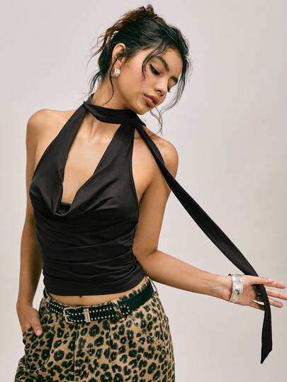 Easelle Women's Retro Sexy Black Hot Girl Y2K Slim-Fit Halter Neck Top, For Going Out - Dark Grey - View 1