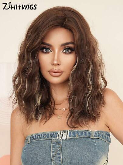 7JHH WIGS 18 Inch Medium Length Brown Blonde Highlight Curly Wig For Women Shoulder Length Wavy Wigs With Side-Swept Bangs, Natural Synthetic Heat Resistant Fiber Hair Wig For Girls Daily Party Use - Blonde Highlight - View 7
