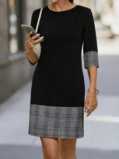 Editum Women's Black PU Patchwork Knit Straight Dress, Suitable For Daily Commute, Versatile Black Dress - Black and White - View 1