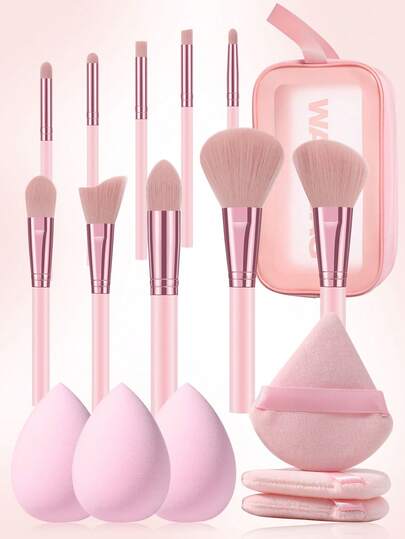 Eid Al-Fitr 17pcs/1pc Complete Makeup Brush Set, Including 10 Soft Makeup Brushes-Such As A Translucent Powder Brush, Blush Brush, Contour Brush, Highlighter Brush, Foundation Brush, Nose Contour Brush, Eyeshadow Brush, And Lip Brush-Plus 1 Travel-Friendly Waterproof Makeup Bag, 3 Triangular Beauty Sponges, And 3 Liquid Makeup Eggs; Ideal For Beginners, Professional Makeup Artists, And Novice Beauty Practice Scenarios. - Pink - View 1