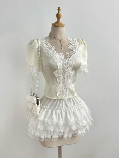 Elamini Elegant Women's Blouse With Bow Tie Lace Puff Sleeves - White - View 8