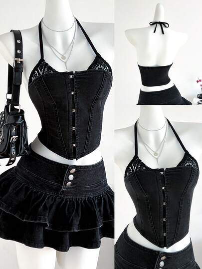 Elamini Women's Fashionable Sexy Contrast Lace Halter Denim Blouse, Summer - Grey - View 1