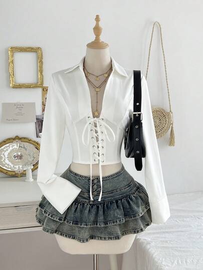 Elamini Women's White Deep Shirred Cinched Waist Drawstring Shirt, Fashionable Casual Versatile Blouse For Outings, Dates, Street Style, Spring/Summer - White - View 1