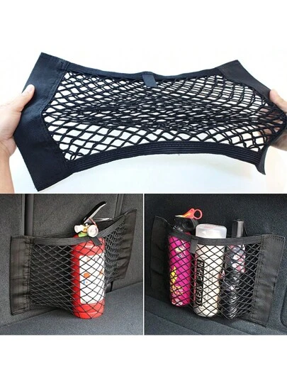 1pc Car Double Layer Storage Net Bag - Car Trunk Organizer Bag, Easy Install With Hook And Loop, Backseat Storage, Car Interior Accessories, Universal Fit - Black - View 1