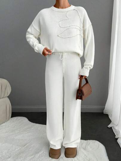 EURMUSE Elegant Crew Neck Drop Shoulder Floral Pattern Pearl Beaded Sweater & Wide Leg Plain Solid Sweater Pants 2 Piece Knit Set - White - View 1