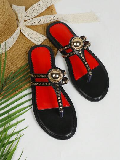 Elegant & Fashion Women's Thong Sandals, Round Toe Flat Low Heel Rivet Color Block Spring/Summer Lightweight Slip-On Black - Black - View 1