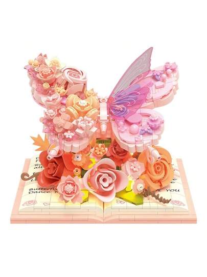 Elegant Fashionable Pink Butterfly Series Handmade Assembly Building Blocks Furniture Decor Set, Music Box Blooming Butterfly + Flower Cover, Suitable For Valentine's Day, Mother's Day, Birthday Gifts And Fashionable Lady's Desk Decorations - Multicolor - View 1