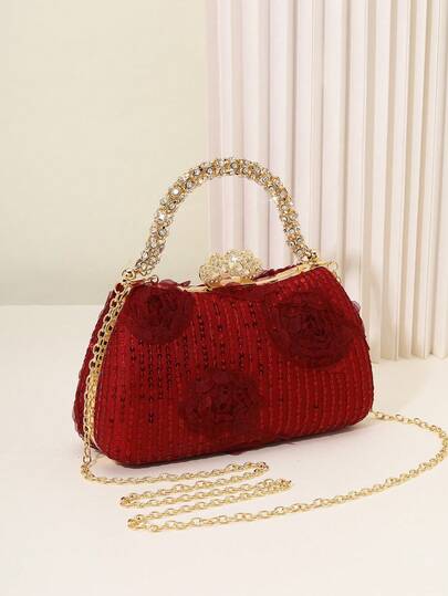 Elegant Floral Randan Petal Design Evening Clutch, Ruffle Handbag, Apricot Color Formal Wallet, Suitable For Weddings,Vacations, Formal Parties, Bals, With Chain Strap, Random Petal Shape, Flower Handbag, Clutche For Wedding, Evening Handbag ForWomen, Handbag For Womenn - Burgundy - View 1