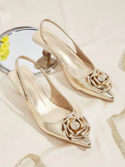 Elegant Gold Floral Decor Glossy Pointed Toe Kitten Heel Pumps With Ankle Strap, Suitable For Date, Shopping, Commute, Party In Autumn/Winter, Valentine's Day, Halloween, Graduation Season - Gold - View 1
