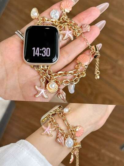 Vòng tay mặt dây chuyền thanh lịch tương thích với dây đeo 38/40/41/42/44/45/46/49mm, được trang trí bằng ngọc trai, sao biển, vỏ sò, cá voi, ốc xà cừ, dây đeo thời trang chủ đề đại dương, chất liệu kim loại, tương thích với Apple Watch Ultra2/1/SE/11/10/9/8/7/6/5/4/3/2/1, phong cách Bohemian, trang sức sáng tạo với hệ màu Dopamine cho đeo hàng ngày, đi biển, kỳ nghỉ hè, phụ kiện ngọc trai, thiết kế dây co giãn, dễ đeo và điều chỉnh.