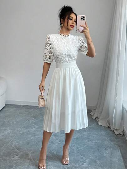 Elenzga Contrast Lace Elegant Pleated Bubble Sleeve Fitted Waist White Mini Dress - White - View 1