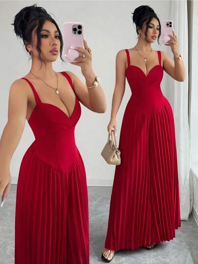 Elenzga Elegant Urban Chic New Women's Burgundy Heart Neck Sleeveless Pleated Slim Ankle-Length Jumpsuit, Suitable For Daily Wear, Weddings, Galas, Commuting, Graduation Parties, Holidays, Dates, Parties, Halloween, Christmas, New Year, Thanksgiving, Weddings - Red - View 1