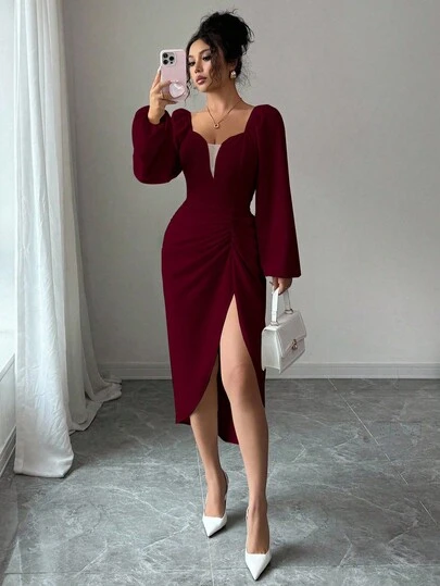 Elenzga Heart Neck Waist Cinched Ruffle Hem Slit Floral Print Elegant Romantic Women Dress, Long Sleeve - Burgundy - View 1