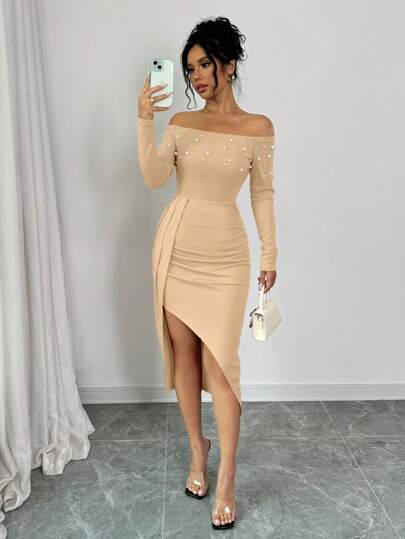 Elenzga Off-Shoulder Ruched High Slit Pearl Design Women Dress Fall Cloth For Women - Khaki - View 1