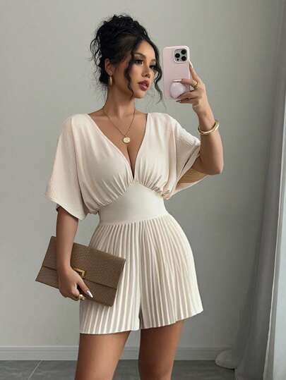 Elenzga Solid Color Deep V-Neck Batwing Sleeve Pleated Elegant Short Jumpsuits For Women - Apricot - View 1