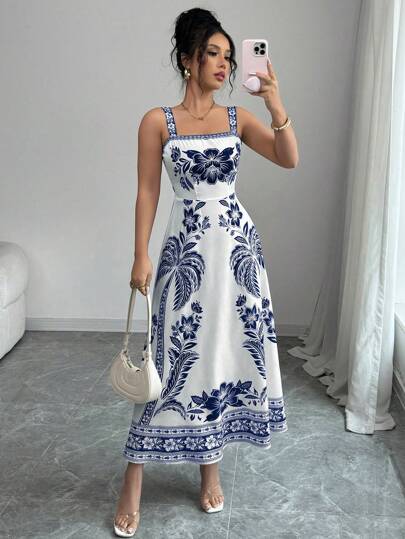 Elenzga Women's Summer Locational Printed Spaghetti Strap A-Line Dress - Navy Blue - View 1