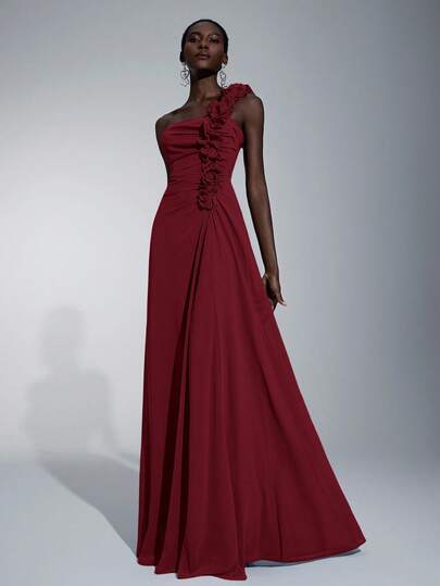 Elitara Adult Bridesmaid Dress With Asymmetric Neckline, 3D Ruffle Trim, Ruched A-Line Silhouette, Bandeau Top - Burgundy - View 1
