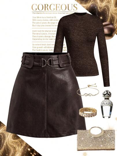Ellevyn A-Line PU Leather Burgundy Minimalist Fashion Midi Skirt - Mocha Brown - View 1